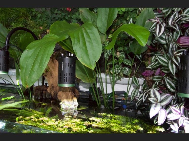 Légende : les Echinodorus sortent de l'eau, formant un lien visuel entre l'aquarium et le mur végétal, alors que des plantes du mur arrivent aussi dans l'aquarium