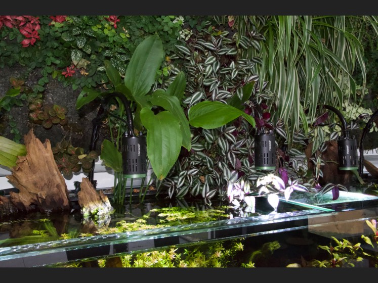Légende : les Echinodorus sortent de l'eau, formant un lien visuel entre l'aquarium et le mur végétal, alors que des plantes du mur arrivent aussi dans l'aquarium