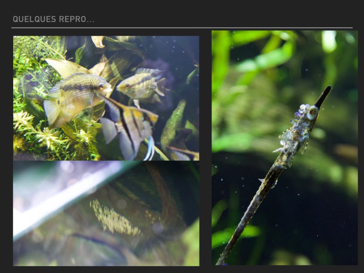 Légende : déjà quelques reproductions dans l'aquarium: Mesonauta, Farlowella, Scalaire, Apistogramma...