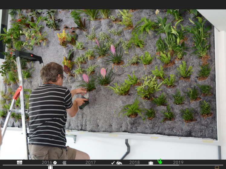 Légende : mise en place des plantes dans la 3ème couche de natte, alors que la poche ainsi créée est agraphée
