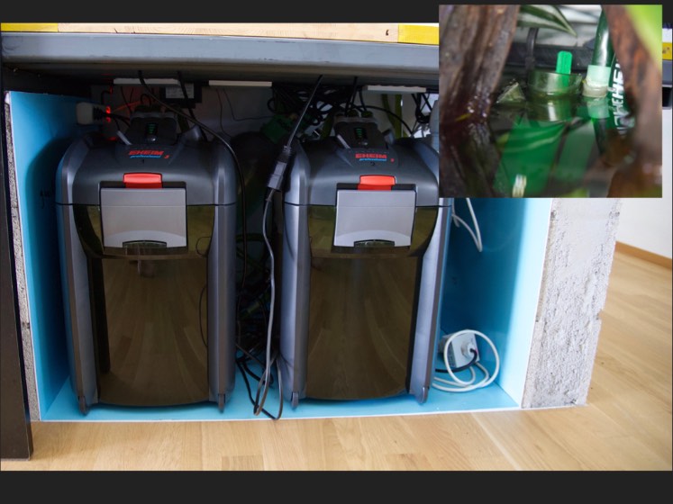 Légende : la filtration de l'aquarium: juste 2 Eheim Pro3 1200XL; utilisation d'un écumeur de surface Eheim