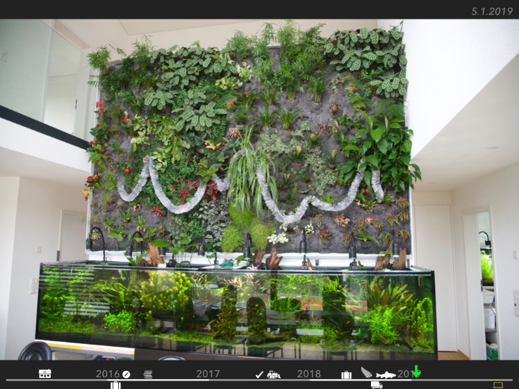 Légende : le mur végétal et l'aquarium à Noël 2018; le bac est en route depuis 3.5 mois, le mur depuis 5 mois
