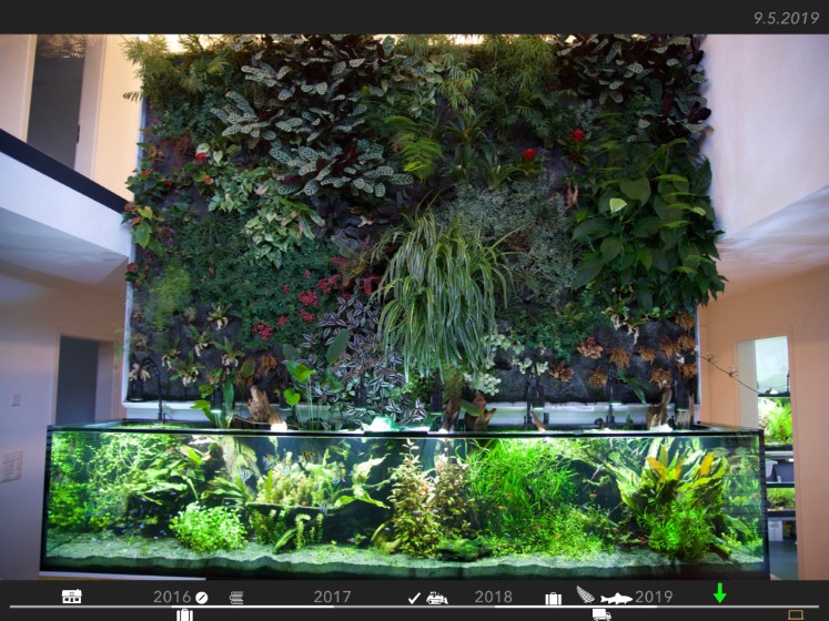 Légende : le mur végétal et l'aquarium à début mai 2019; le bac est en route depuis 7.5 mois, le mur depuis 9 mois